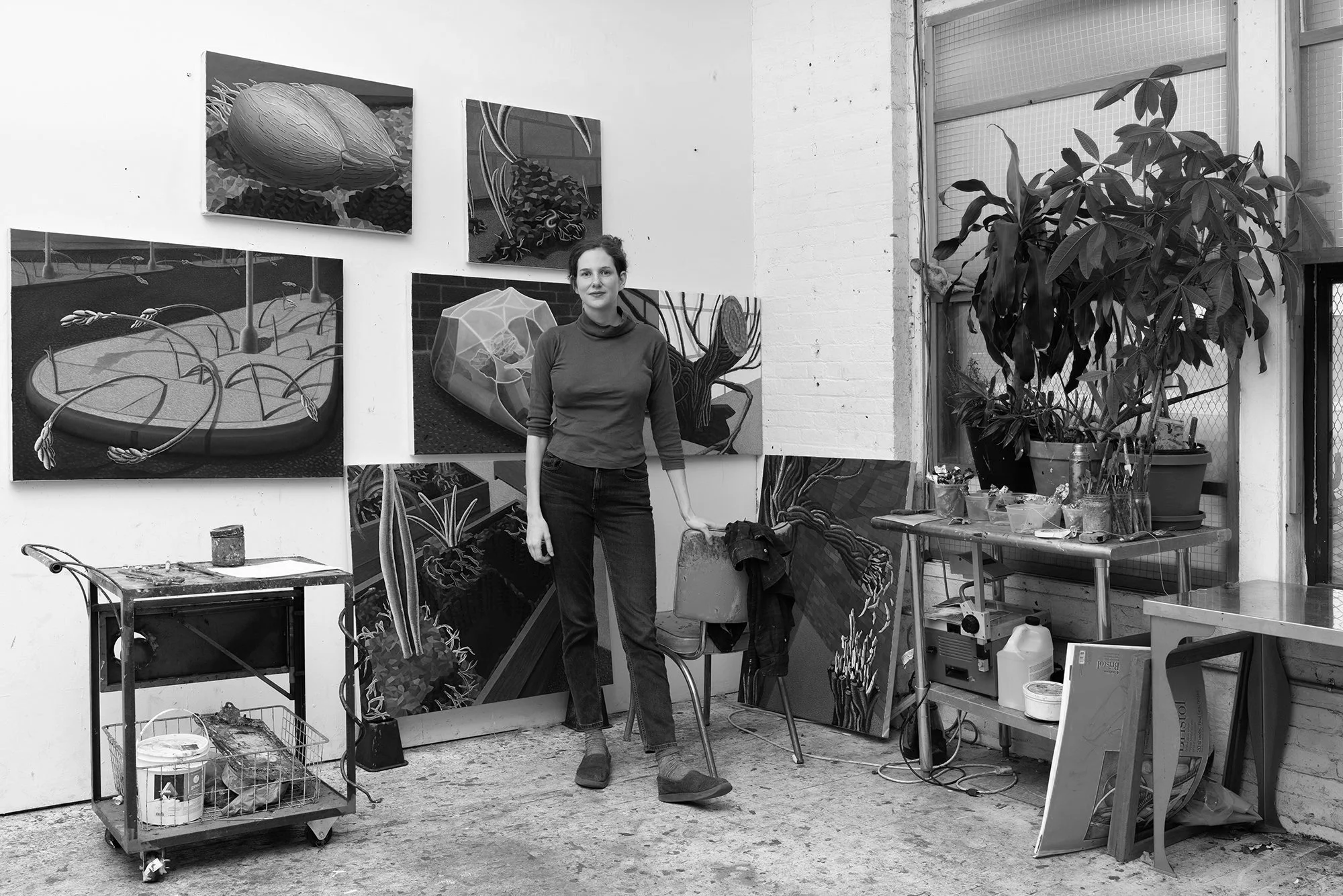 Sally Jerome is a painter living and working in New York City. (Rhode Island School of Design, BFA ‘12) Her work is based on her encounters with nature while walking New York’s streets during the pandemic, Jerome’s works create a world in which plants and cement co-exist as symbols of psychology and sociology. Hope, optimism, and rebirth are present in her paintings, reflecting on the enduring human spirit despite the ever-changing environment.